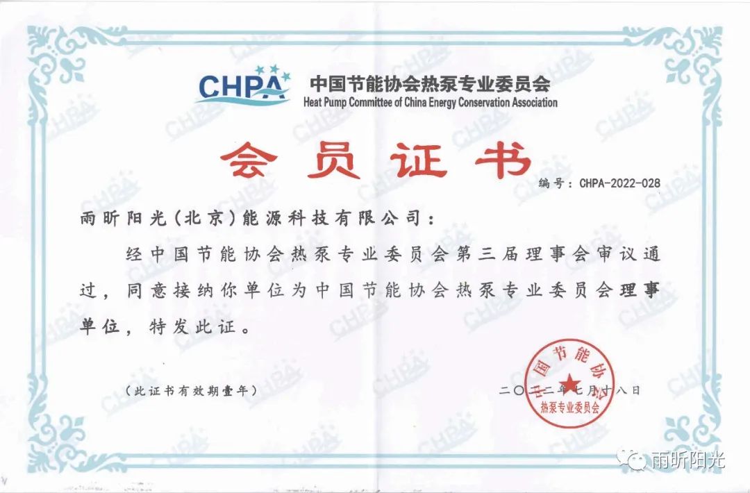 2022年7月18日,經中國節能協會熱泵專業委員會第三屆理事會審議通過,雨昕陽光(北京)能源科技有限公司再次成為中國節能協會熱泵專業委員會理事單位,董事長孫培雨先生被聘為中國節能協會熱泵專業委員會第三屆理事會理事。