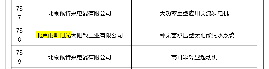 雨昕陽光無菌承壓無動力太陽能熱水系統入圍第九批北京市新技術新產品(服務)名單