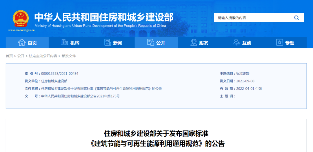 住建部2021年10月13日在官方發布住房和城鄉建設部關于發布國家標準《建筑節能與可再生能源利用通用規范》的公告,批準《建筑節能與可再生能源利用通用規范》為國家標準,將于2022年4月1日起實施。