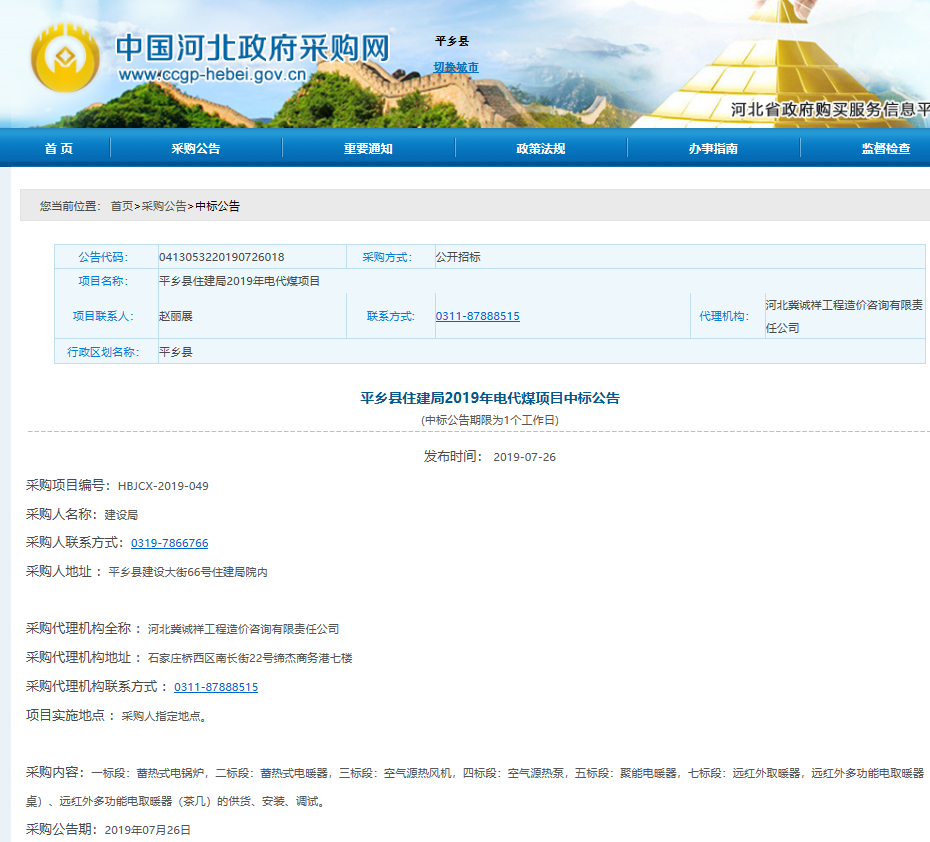 近日,河北平鄉縣住建設局2019年電代煤項目開標,雨昕陽光再次成功中標,此次中標已是河北省煤改電中標的“第四城”。公司已做好充分準備,將全力以赴為助力河北“煤改電”工程,為廣大民眾帶去了溫暖舒適的冬季采暖服務。