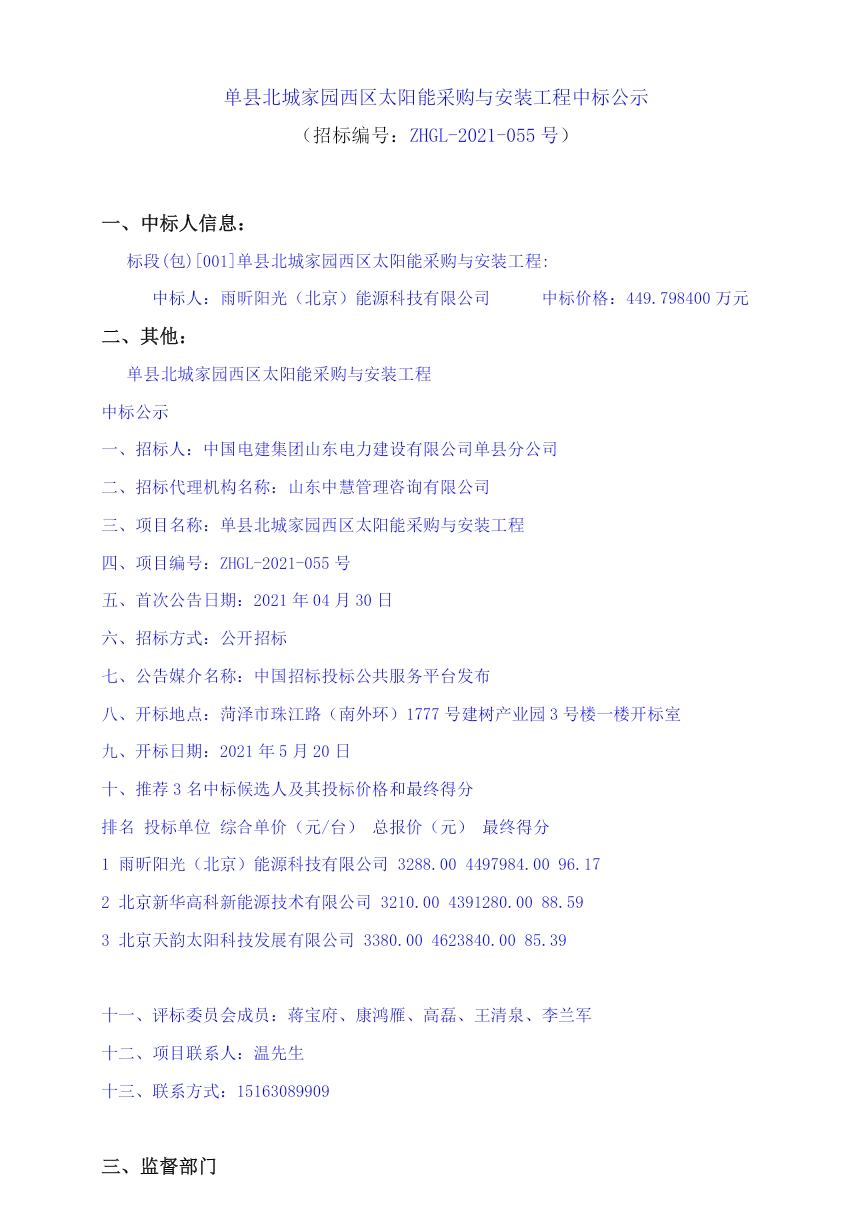 雨昕陽光中標單縣北城家園西區太陽能供貨與安裝工程