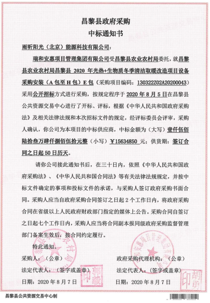祝賀雨昕陽光中標昌黎縣光熱+生物質爐項目