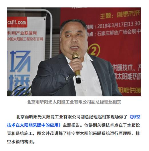 3月17日至19日,為期三天的第十五屆(2018)中國國際太陽能熱利用產品品牌博覽會暨第十三屆中國清潔能源采暖、供熱制冷產品采購節在石家莊市解放廣場會展中心舉行。本屆展會由中國農村能源行業協會太陽能熱利用專業委員會、中國節能協會太陽能專業委員會、中國太陽能熱利用產業聯盟主辦,開幕式由《中國太陽能產業資訊》《中國太陽能工程》執行總編曾衡主持。 雨昕陽光公司與會參展,現場展示了公司太陽能熱水、煤改清潔能源取暖等相關的最新產品和工程案例,受到了熱烈關注。 在2018中國太陽能清潔供暖技術、產品與解決方案高峰論壇,北京雨昕陽光太陽能工業有限公司副總經理趙相東現場做了《排空技術在太陽能采暖中的應用》主題報告。他講到關鍵技術點在于水箱設置和系統施工,圖文并茂講解了排空型太陽能采暖系統運行原理圖、排空水箱結構圖。